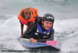 “I ride on my stomach and Ricochet stands behind me and despite having to straddle me, she does a great job balancing and counterbalancing the board,” said Patrick. “I’ve learned to trust her and we surf well as a team.