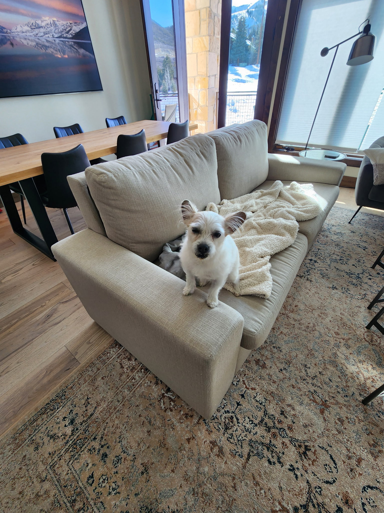 We booked through Vacasa at Blackstone at the Canyons, a two-bedroom, 2.5-bath condo, 1,188 sq. ft., sleeps 5, and pet-friendly. Across from the Canyons Cabriolet and Transit Hub, it offered top-of-the-line appliances, underground parking, and easy access to the slopes, Main Street, and Canyons Village. Honey loved it as much as we did! Be sure to use Vacasa for your next adventure